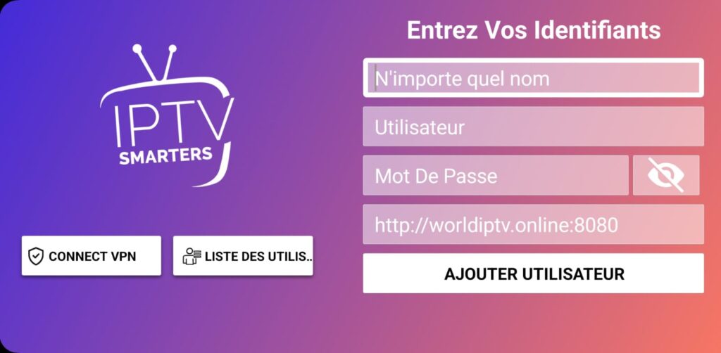 - Étape 3 : Saisissez les informations de connexion que nous vous avons fournies après avoir souscrit un abonnement chez nous. Cliquez maintenant sur « AJOUTER UN UTILISATEUR » pour passer à la section suivante.